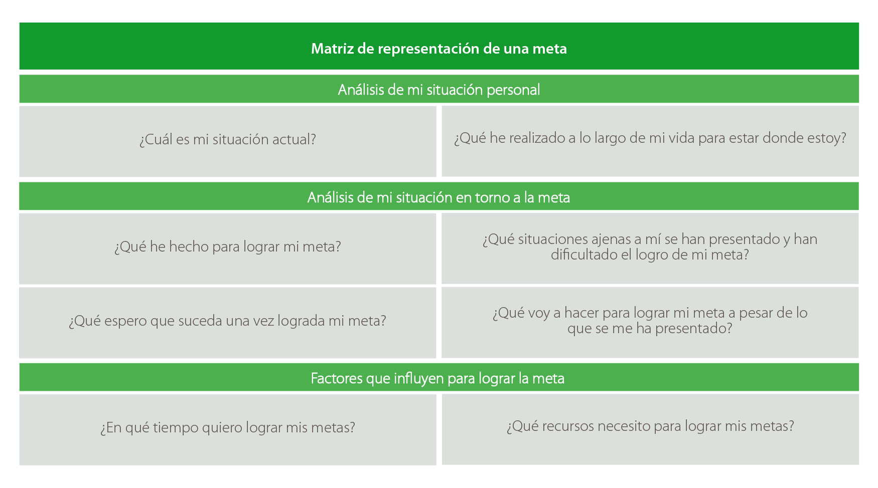 Al determinar una meta, es normal que te desanimes por no lograrlas como esperabas. Para no caer en el desánimo, es importante recordar todo lo que has hecho hasta el momento para lograr la meta y, si es necesario, señalar parcialidades y seguir tratando de lograr lo que deseas, aunque no con la misma rapidez; revisar de nuevo lo que has hecho y retomar el camino para lograr lo que te has propuesto; finalmente, recordar el sueño que te fijaste y lo que esperas cuando logres el sueño. Para ello, puedes realizar la siguiente matriz: