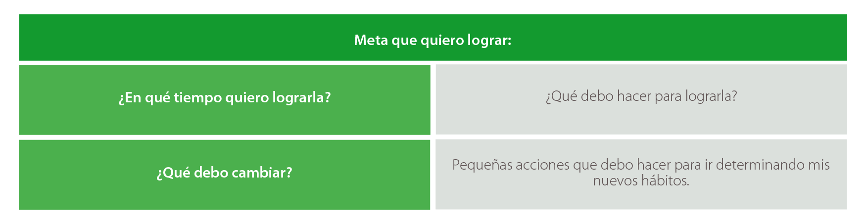 Con estas respuestas, puedes saber cuáles cambios debes hacer en tu vida cotidiana, el tiempo que tienes para ello según el plazo en que quieras lograr tu meta y si requieres apoyo de alguien.