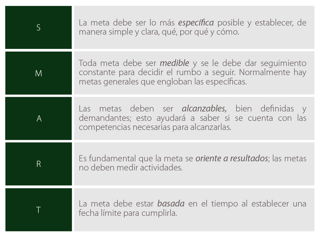 El método SMART (por sus siglas en inglés: specific, measurable, achievable, results focused, time bound) ayuda a determinar las metas de una forma completa: