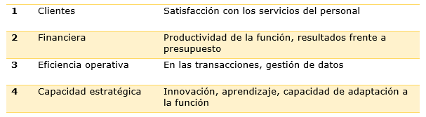 Quienes lo han desarrollado y aplicado para la función de los recursos humanos consideran a la función como si fuera una unidad de negocio en sí misma, de manera que los directivos de esta área deben obtener medidas referentes a cuatro categorías: