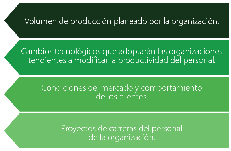 Ahora bien, para que la plantilla establezca las necesidades de recursos humanos se basa en factores externos e internos. Entre los primeros se encuentra la variación en la demanda de los bienes o servicios ofrecidos por la empresa, el grado de liberación del sector, las estrategias de crecimiento por la competencia y el proceso de globalización del sector.