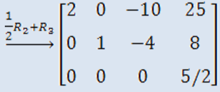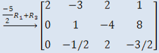 Una vez escogido el pivote, se eliminará el término 5 del tercer renglón; esto se logra al multiplicar el primer renglón por (-5/2) y sumarlo posteriormente con el tercero: