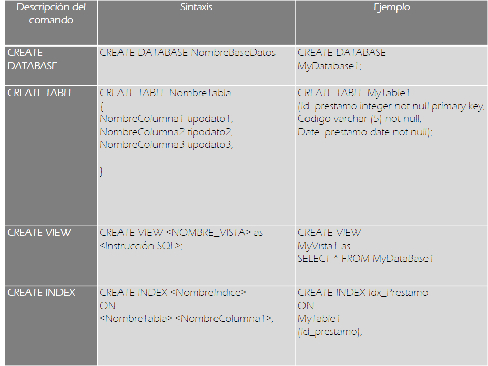 A continuación mostramos algunos ejemplos de los comandos DDL y DML que se utilizan de manera generalizada en lenguaje SQL.