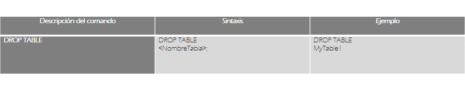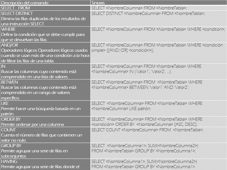 Los ejemplos descritos en las tablas anteriores tienen el simple propósito de que te familiarices con el uso de lenguaje SQL, su sintaxis, comandos y el uso de caracteres especiales como comillas, corchetes, llaves y paréntesis.