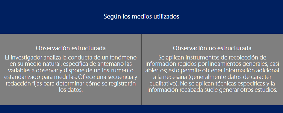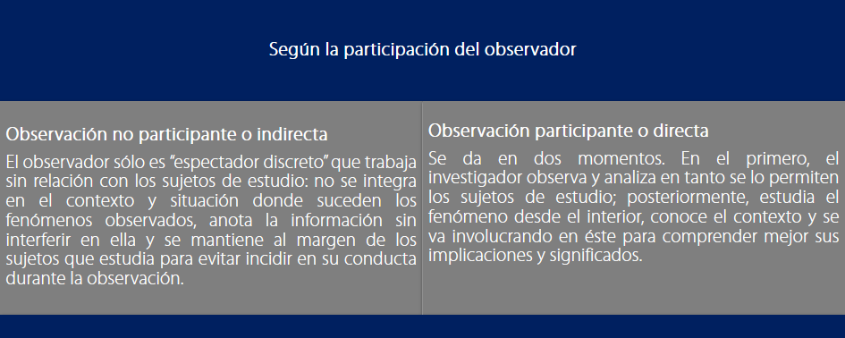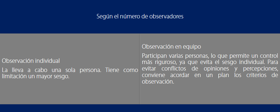 Con base en su forma o estructura, la observación puede clasificarse con base en estos parámetros: medios utilizados, participación del observador y número de observadores.