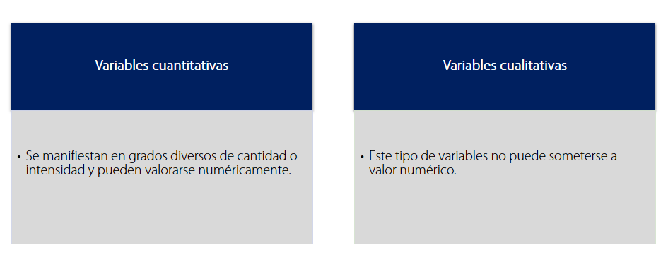 En cambio, si se pretende conocer el volumen de producción de un artículo “X” y las variaciones que presentó durante los dos últimos años, la variable “volumen” es cuantitativa y su análisis será con base en términos de promedios. Por ejemplo, en los dos últimos años la producción fue de 20 000 unidades del artículo “X”, promedio anual. Luego, la producción total ascendió a 40 000 unidades durante los dos años siguientes.