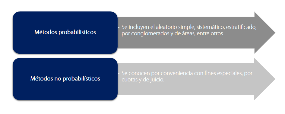 La obtención de la muestra se hará mediante la aplicación de herramientas, técnicas y métodos propios de la estadística. Dependerá del tipo de investigación a realizar y, por ende, de la hipótesis y diseño de investigación. En este orden, los métodos de muestreo se clasifican en dos grandes rubros: