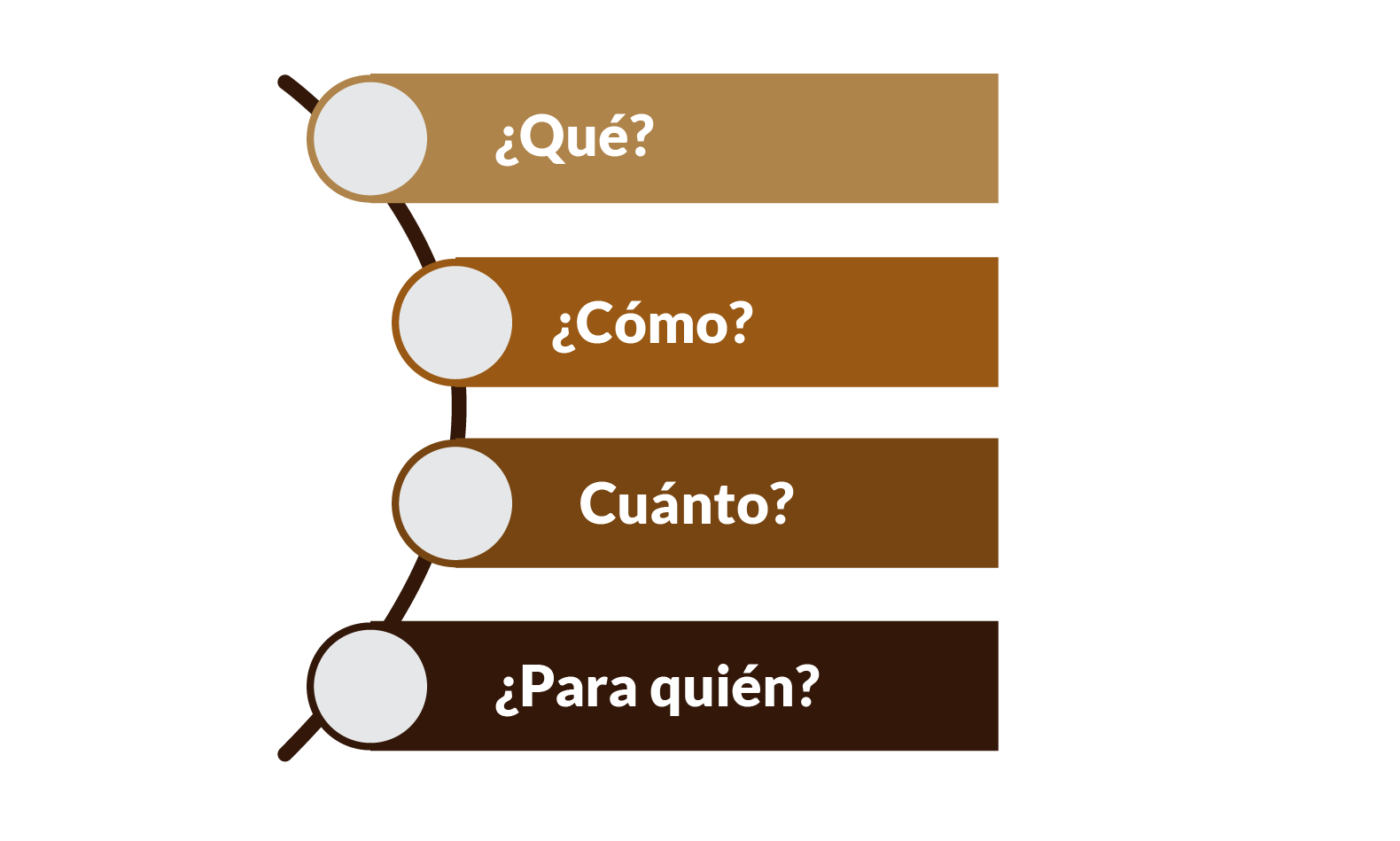 El “¿qué?” se refiere al bien, producto o servicio que se busca realizar; el “¿cómo?” a los factores productivos a utilizar, ya sean recursos naturales, trabajo o capital; “¿cuánto?” alude a la cantidad a producir y al recurso monetario que se necesita para llevarlo a cabo; y, por último, “¿para quién?” se relaciona con los consumidores potenciales o posibles que adquirirían lo que se produce para satisfacer sus necesidades.