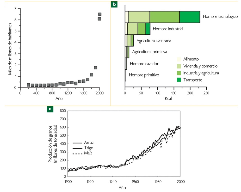 El acelerado crecimiento de la población mundial y las actividades del hombre, relacionadas con su desarrollo tecnológico y económico, que ha implicado un aumento de la explotación de recursos naturales para la obtención de materia y energía (principalmente a partir de los combustibles fósiles), contribuyó de forma importante en lo siguiente: