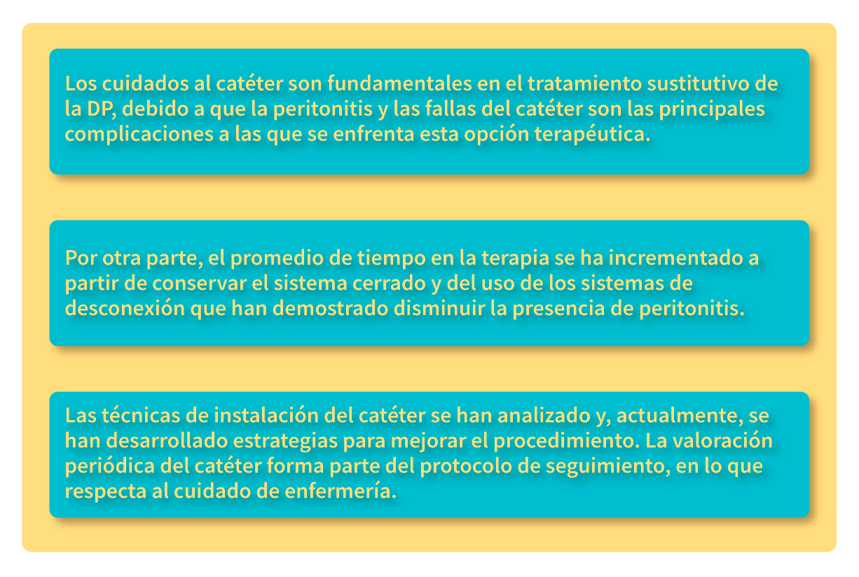 La instalación de un catéter en la cavidad peritoneal se realiza a través de diversas técnicas como la percutánea y la quirúrgica. Esta última es la más segura, por lo que los cuidados de enfermería en el periodo posoperatorio son fundamentales para iniciar el tratamiento y evitar complicaciones que afecten los beneficios esperados de la terapia sustitutiva, tales como la migración del catéter. Dicha instalación garantiza la ubicación más precisa y evita la migración del catéter en la cavidad peritoneal, lo cual llega a ser un obstáculo para la infusión y drenaje de la solución de diálisis por la mala colocación del aditamento. La peritonitis puede ser otra complicación; sin embargo, siempre existe la posibilidad de retirar el catéter.