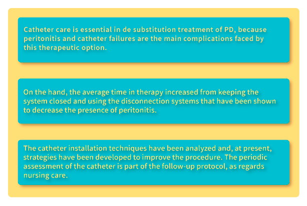 Both modalities of PD are the means by which the dialysis solution is introduced into the peritoneal cavity of the person with Chronic Renal Failure (CRF). The use of catheters as a means of access to the peritoneal cavity dates from the creation of the polyvinyl catheter in 1959, with which it was sought to avoid folds and obstructions; however, its placement was difficult.