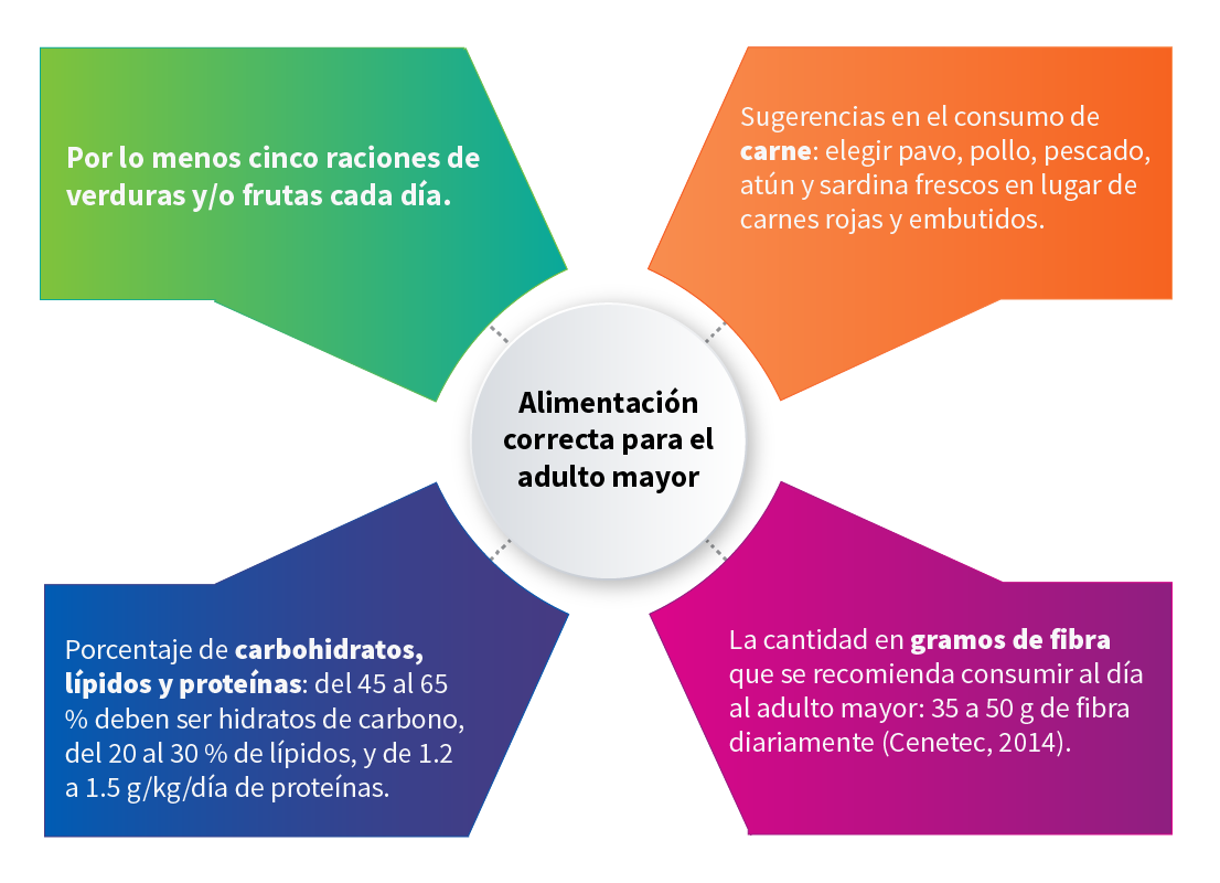 Los cambios anatomofisiológicos que se presentan con el proceso de envejecimiento y la presencia de enfermedades crónico-degenerativas, aunados a las creencias y valores relacionados con el acto de comer, ocasionan que el adulto mayor, en la etapa de la vejez requiera del consumo de alimentos con determinadas características para satisfacer los requerimientos nutricionales de acuerdo con la presencia de enfermedades y actividad física.