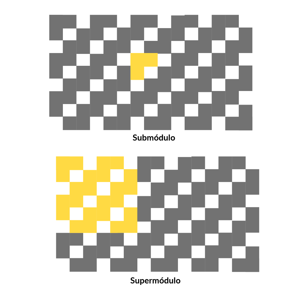 El módulo es una forma o figura sencilla, que se repite y relaciona con otras semejantes o iguales en una estructura modular. Esto quiere decir que aparece más de una vez en el espacio bidimensional o tridimensional (Calavera y Jiménez, 2013, p. 72). Por lo tanto, sus características de simplicidad, secuencialidad y ritmo tienden a unificar y organizar un diseño para que pueda percibirse fácilmente; en ello radica su abstracción y síntesis.