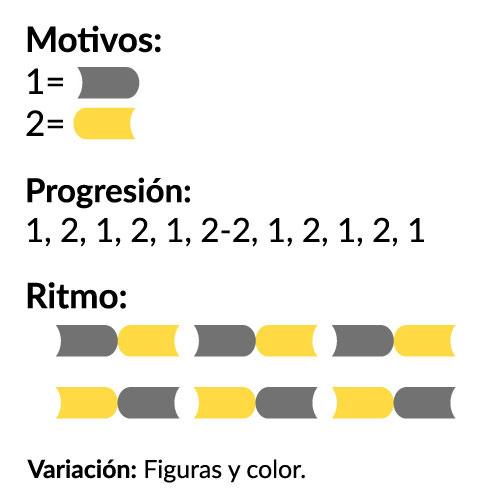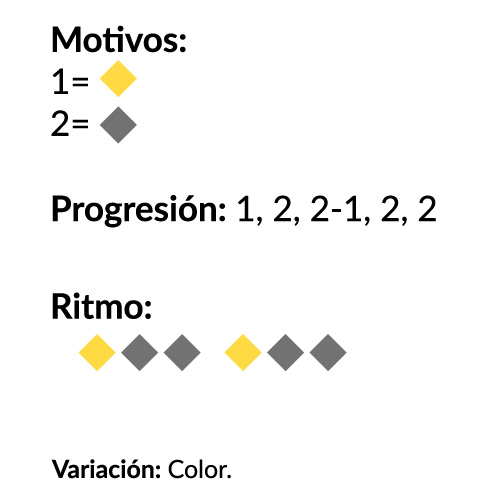 Al utilizar módulos más de una vez, se obtiene la repetición, es decir, la unidad repetida de manera regular con la finalidad de crear una configuración más grande; puede referirse a la forma misma o al diseño dibujado en ella. Los sistemas de repetición requieren ritmo para generar la armonía del todo. El ritmo es una propiedad esencial de la forma y puede utilizarse para crear composiciones estáticas o dinámicas (Maris, 2009, p. 146). En el ritmo intervienen dos variables indispensables: el intervalo o periodo (distanciamiento entre los motivos) y la progresión numérica (cantidad de motivos que intervienen y sus cualidades).