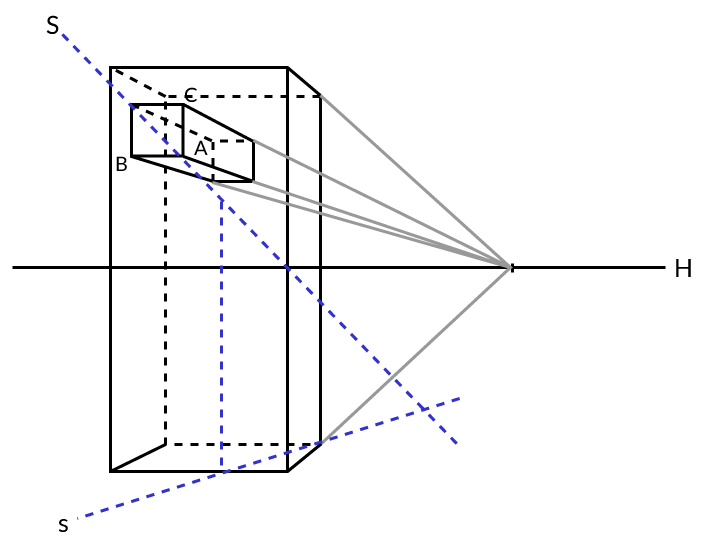 Se dibuja un prisma rectangular adicionado en el frente de otro, con posición vertical en perspectiva. Después, se traza la proyectante S y su proyección horizontal s, donde esta última se intersecta con la base del volumen principal.