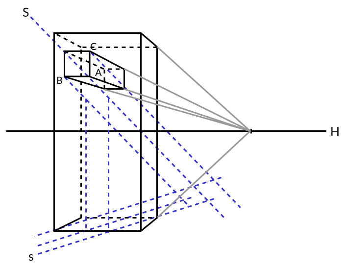 Se comienza con un prisma con el mismo volumen y la misma adición que en el tema anterior, donde la proyectante S pasará por A y a; lo mismo pasa con las demás proyectantes. Después, se contornea y oscurece la sombra.
