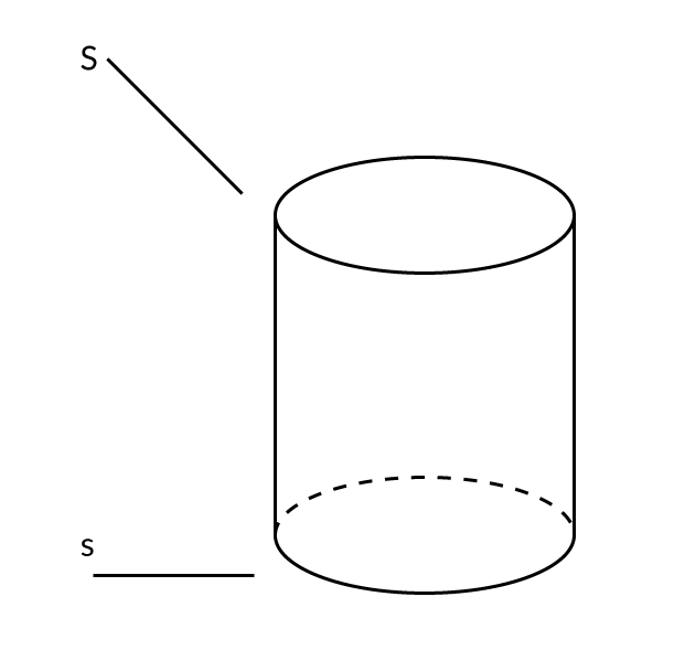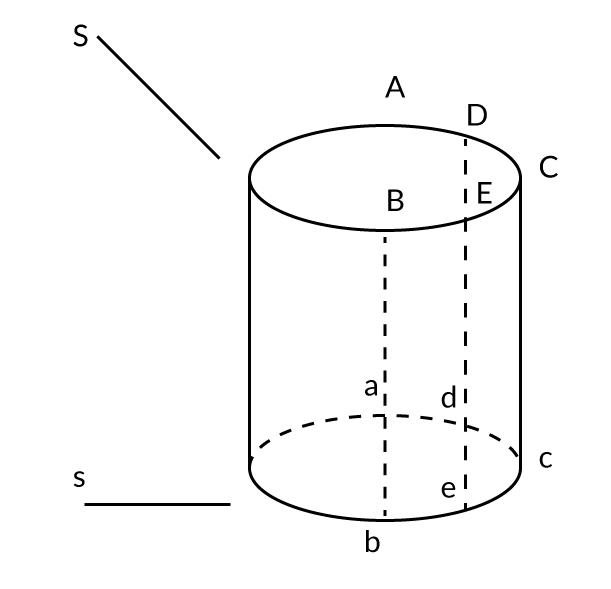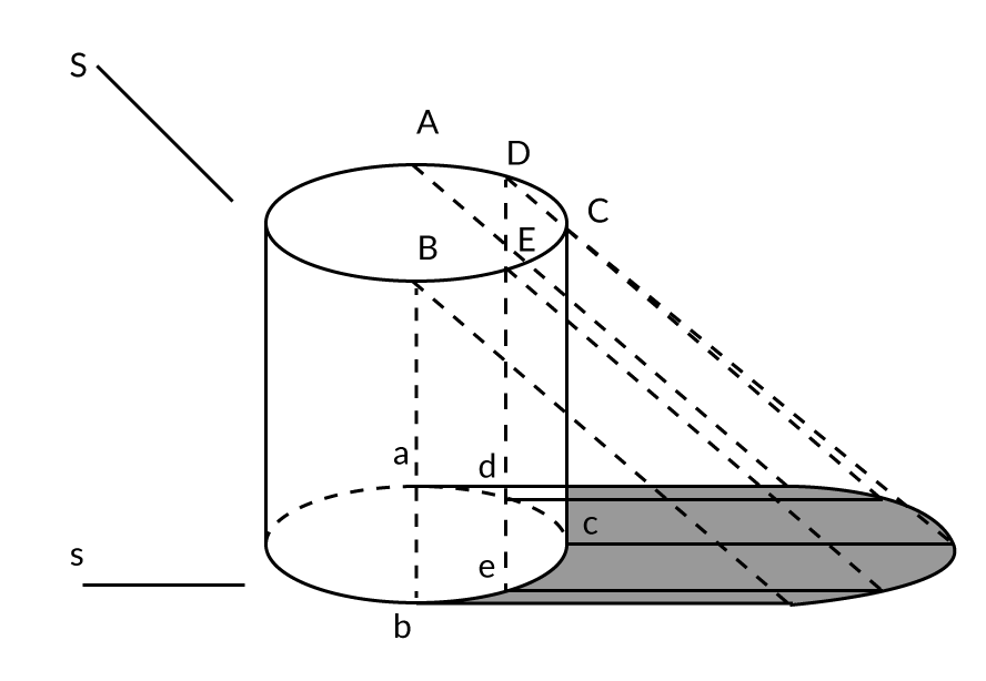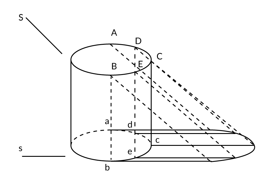 Se dibuja el cilindro en perspectiva, la proyectante S y su proyección horizontal s. Luego, se denominan varios puntos en la tapa: A, B, C, D y E. También se localiza su proyección horizontal a, b, c, d y e.