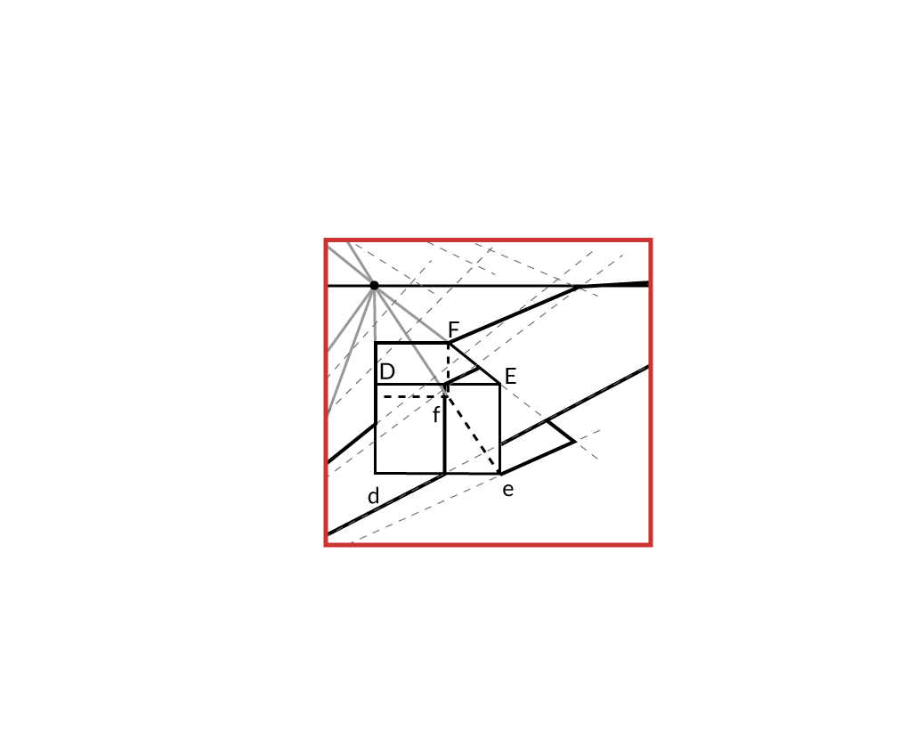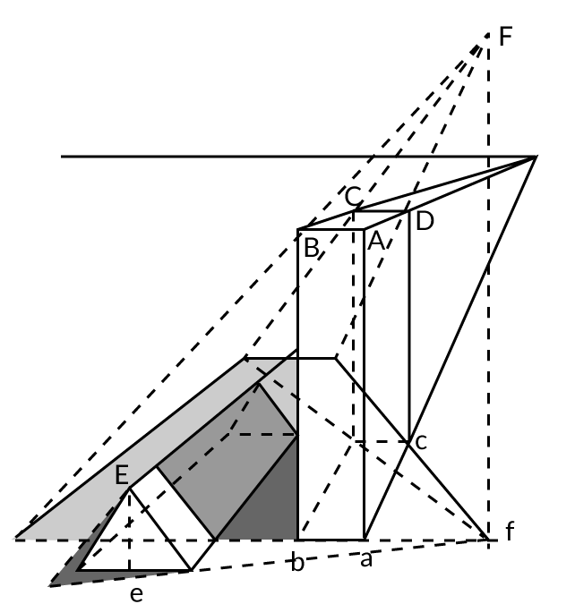 Se delimita la sombra de la vertical B-b sobre el volumen y también sobre el piso. Luego, del punto b se prolonga hasta la base d-e; en dicha intersección se levanta de manera análoga una línea vertical hasta la tapa, así como en el punto de intersección con la base que levanta la vertical. De esa manera, las dos líneas que suben hasta la tapa muestran lo que cubre la sombra. Es como si el plano descrito por la proyectante y su proyección, cortara la esquina E-e del prisma. Después, continúa delimitando el contorno del prisma mayor; notarás que casi cubre al volumen con excepción de la esquina E-e.