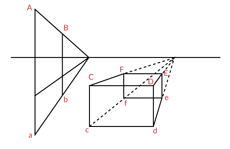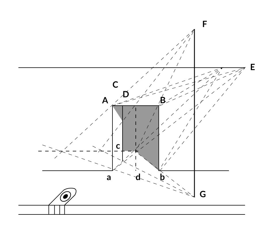 Se denominan los vértices frontales del vano y sus proyecciones. También se trazan las proyectantes de las verticales Aa y Bb para limitar la sombra en el vano de la primera puerta. La sombra en el marco baja desde A hasta el borde Cc interior del marco. Así, para determinar la sombra de la altura en éste, se realiza lo siguiente: 1) traza la proyectante que pase por c; 2) encuentra la proyección horizontal d entre la proyectante del punto anterior y una línea que una a y b; 3) localiza el punto D en el marco de la puerta; 4) traza la proyectante por D; 5) hasta el punto donde se intersecta la proyectante FD con Cc, llegará la sombra desde A.