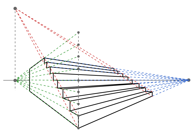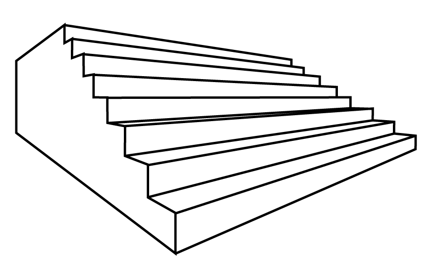 Se dibuja un plano escalonado a dos puntos de fuga y se trazan las aristas que permitan proporcionar las escaleras, de acuerdo con la deformación angular y de profundidad. Luego, se eliminan todos los trazos auxiliares para no saturar el dibujo.