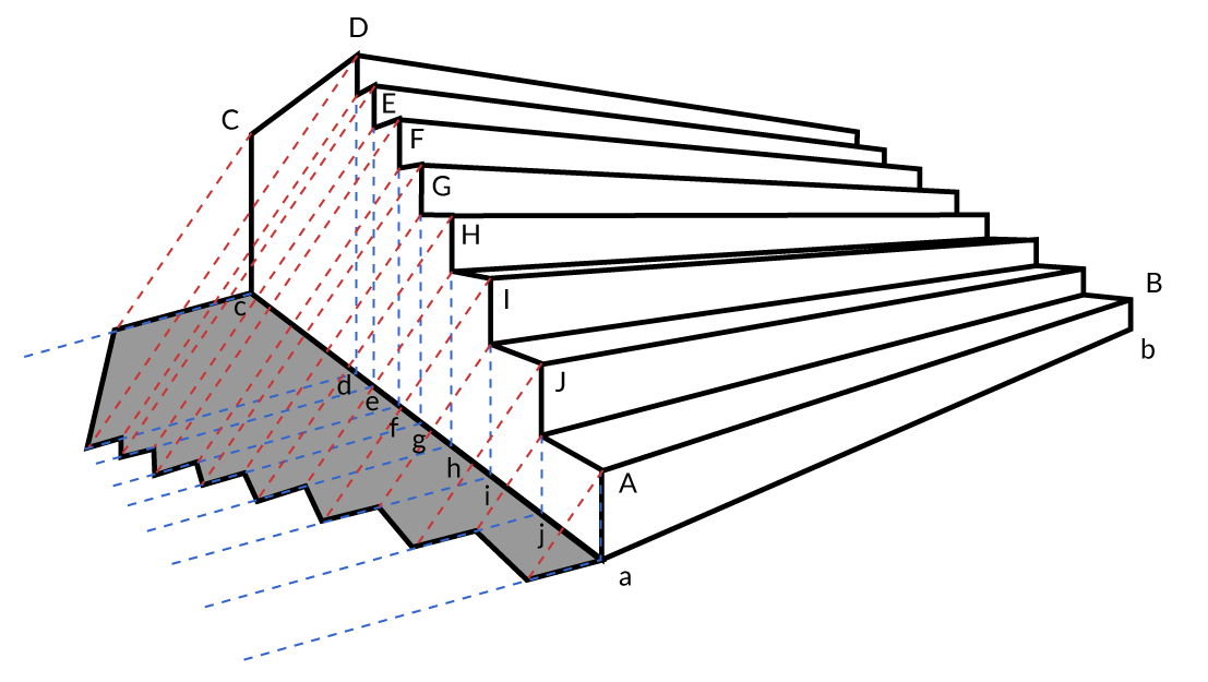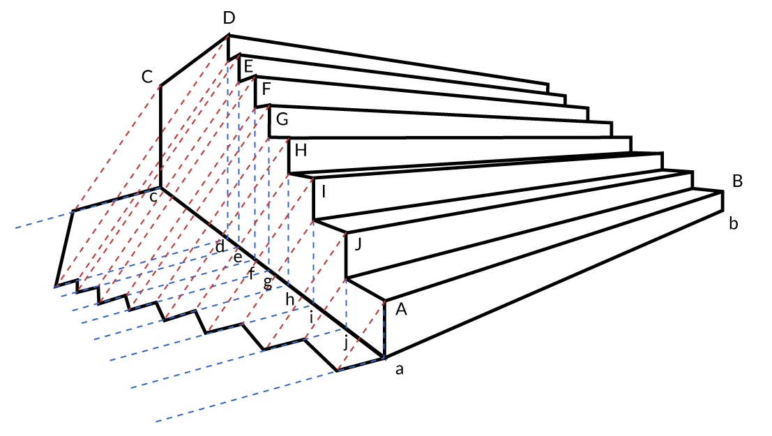 Los planos escalonados se configuran cuando los detalles a representar no forman un solo plano, por lo cual es necesario adoptar varios planos perpendiculares entre sí, para generar un corte por planos paralelos (Castilla, 2014). A continuación, se muestra el procedimiento para determinar la sombra de un plano escalonado sobre el suelo, a contraluz con luz natural.