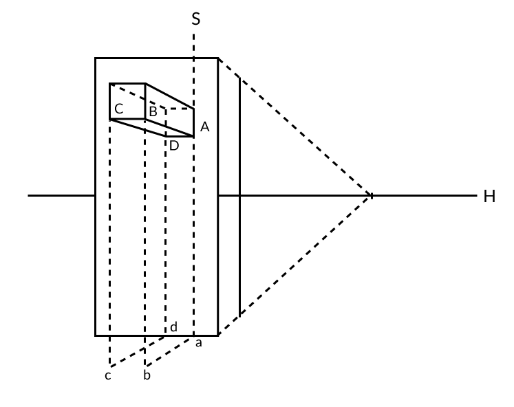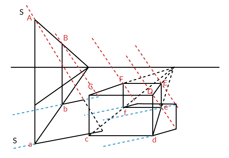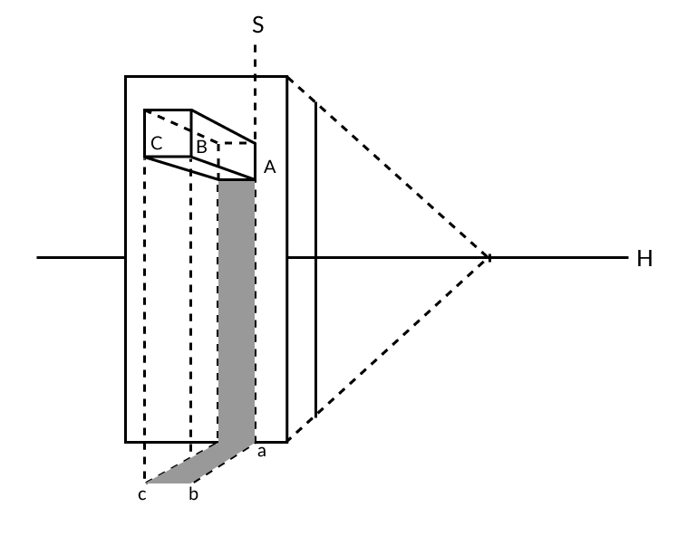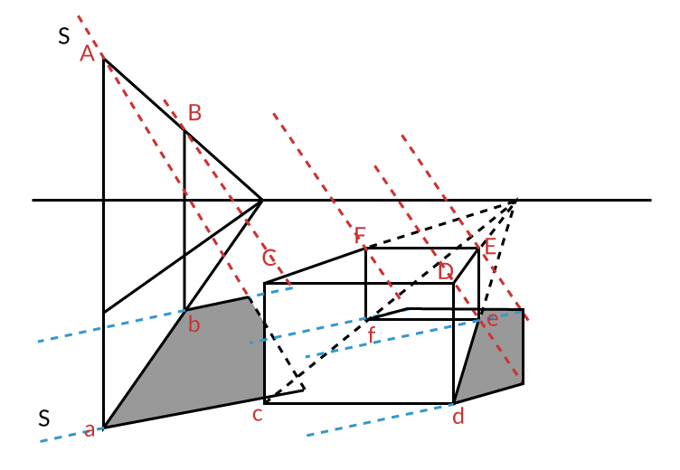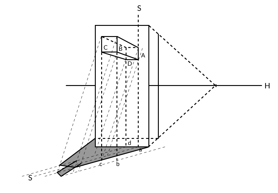Después, la proyección s que se ubica a nivel horizontal se pasa por la proyección a, hasta que se intersecta en el espacio con el rayo de luz S. Así, la dimensión de la sombra en la línea Aa está limitada por la proyección s, hasta la intersección con el rayo de luz S.