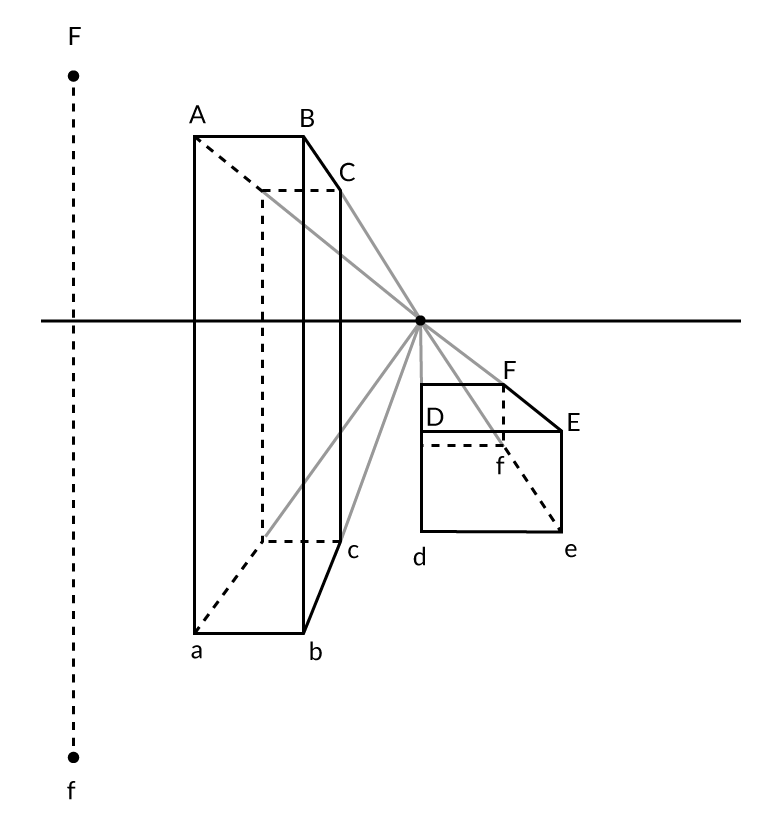 Se dibuja el prisma y el foco con su proyección, y también se denominan los vértices y su proyección. Después, se proyecta la sombra de la vertical Aa.