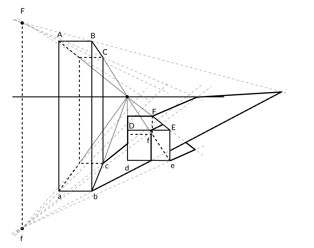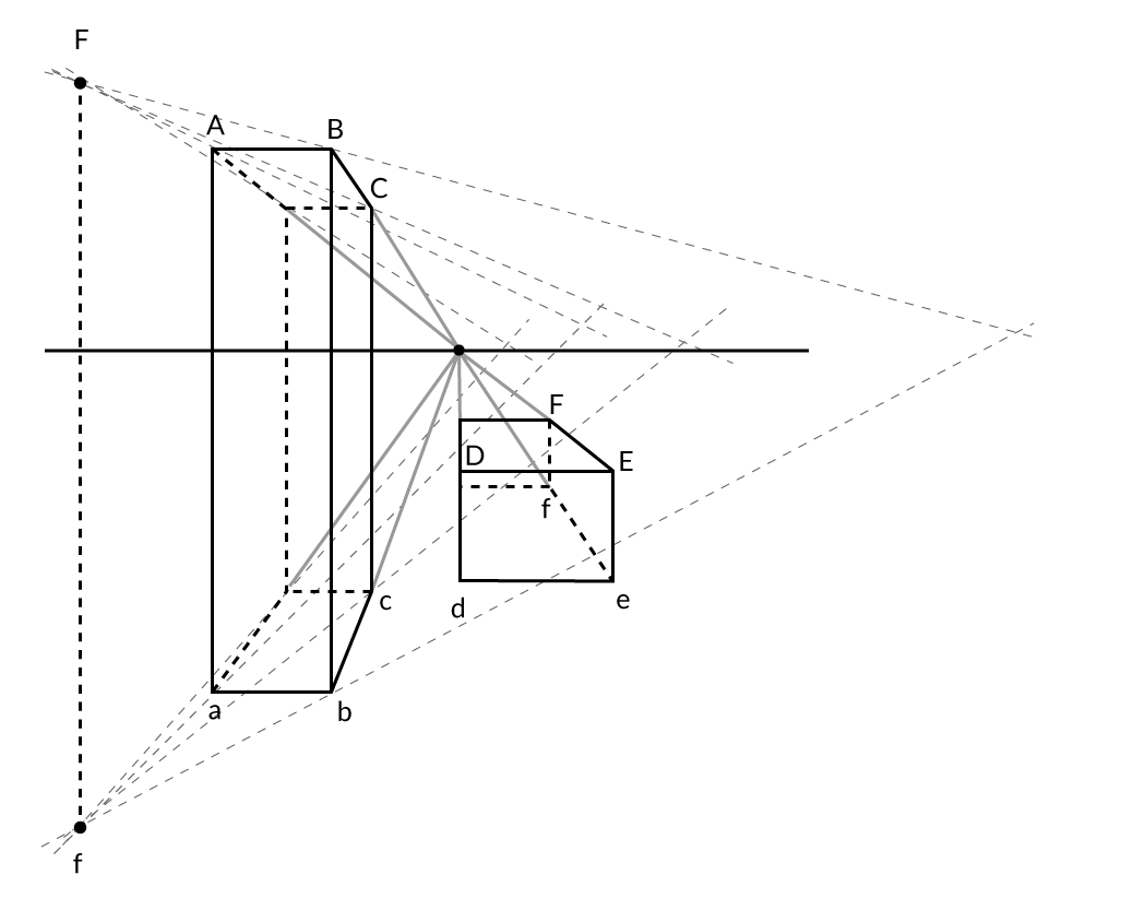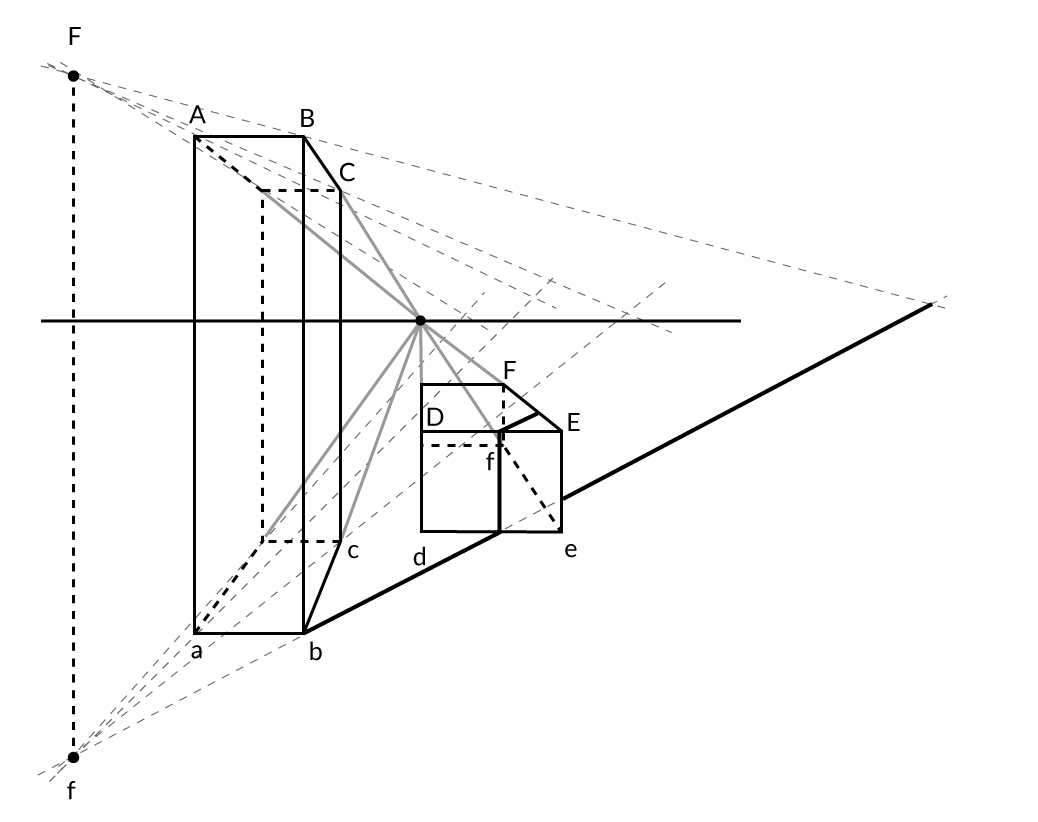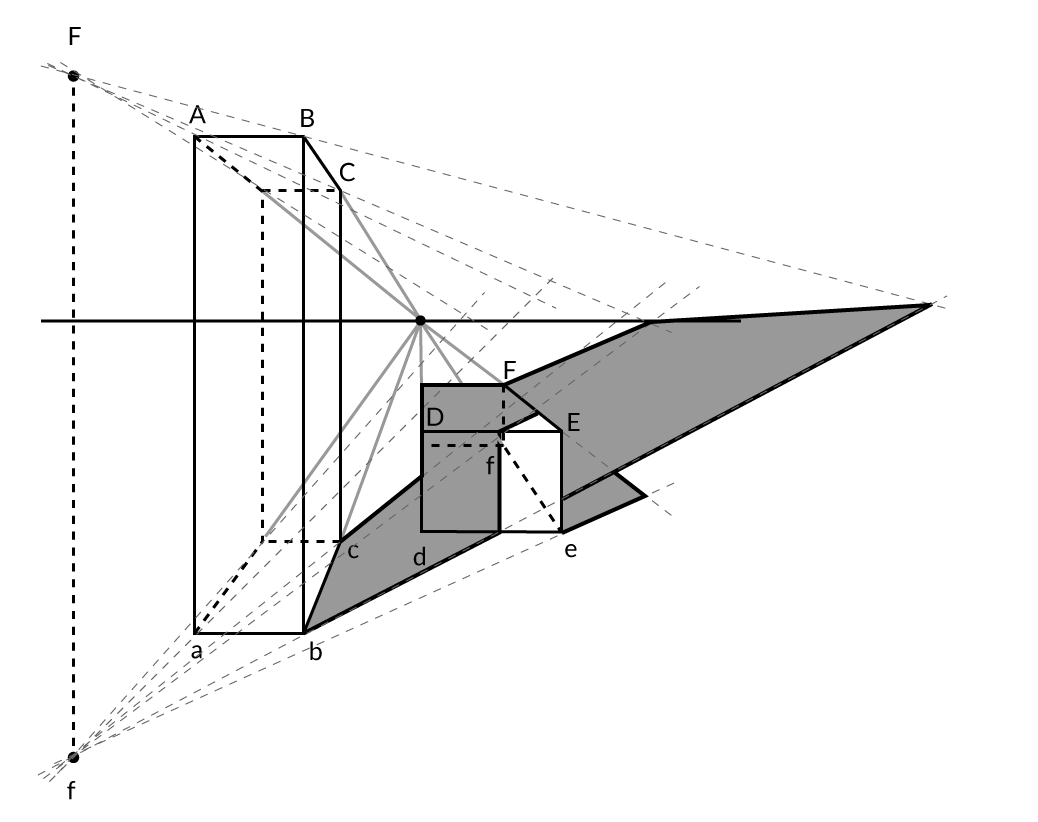 Se dibujan en perspectiva los prismas, el foco y su proyección. También se denominan los vértices del prisma cuadrangular y sus proyecciones, y se delimitan las sombras de las verticales. Posteriormente, se traza una paralela a las aristas menores que limitan la cara rectangular, donde la sombra se intersecta con la base del prisma triangular, ya que dicha cara está en posición vertical de forma paralela a la continuación del plano.