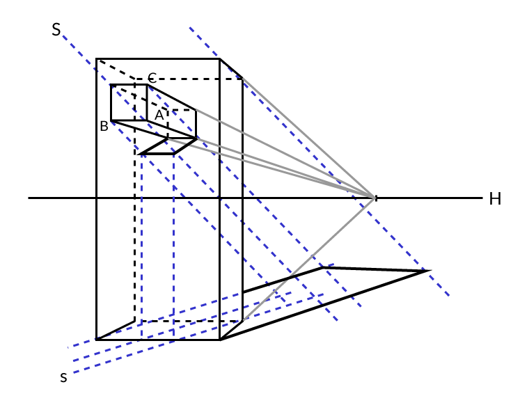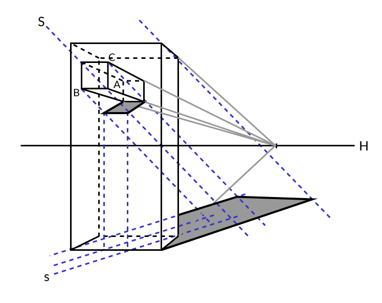Se traza la proyectante S que pase por el vértice encima de C, y con proyectantes paralelas a S, se hace lo mismo con el resto de los vértices. También se trazarán los límites de la adición. Posteriormente, se oscurece la sombra.