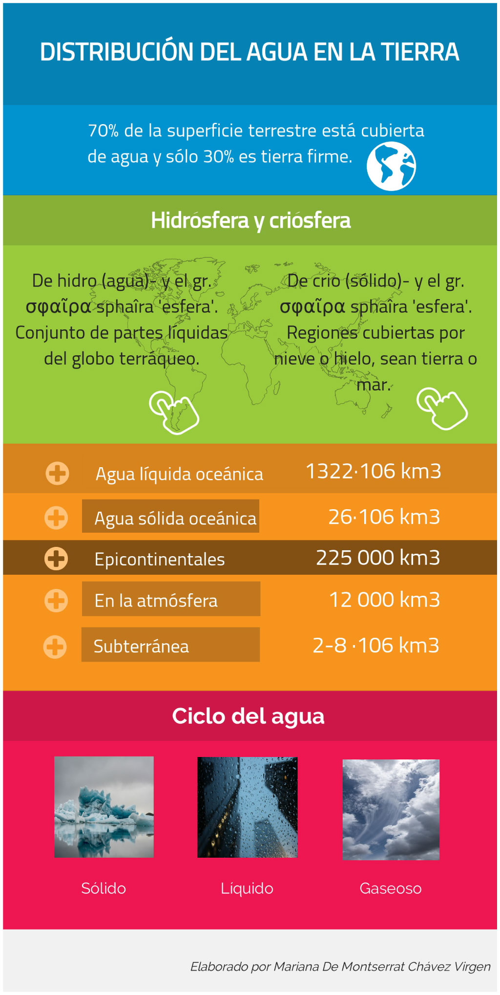 Centro de geociencias. UNAM. Hidrósfera. (s. f.). Consultado el 7 de marzo de 2019 de http://webcache.googleusercontent.com/search?q=cache:http://www.geociencias.unam.mx/geociencias/iype_cgeo/hidrosfera.html