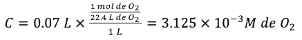 A 10 °C y a una presión del O2 de 2.0 atm, la solubilidad de éste en agua es 70.0 ml por litro de disolución. Determina cuál es la molaridad del O2 en una solución acuosa saturada, cuando el O2 está sometido a su presión parcial normal en el aire de 0.40 atm.