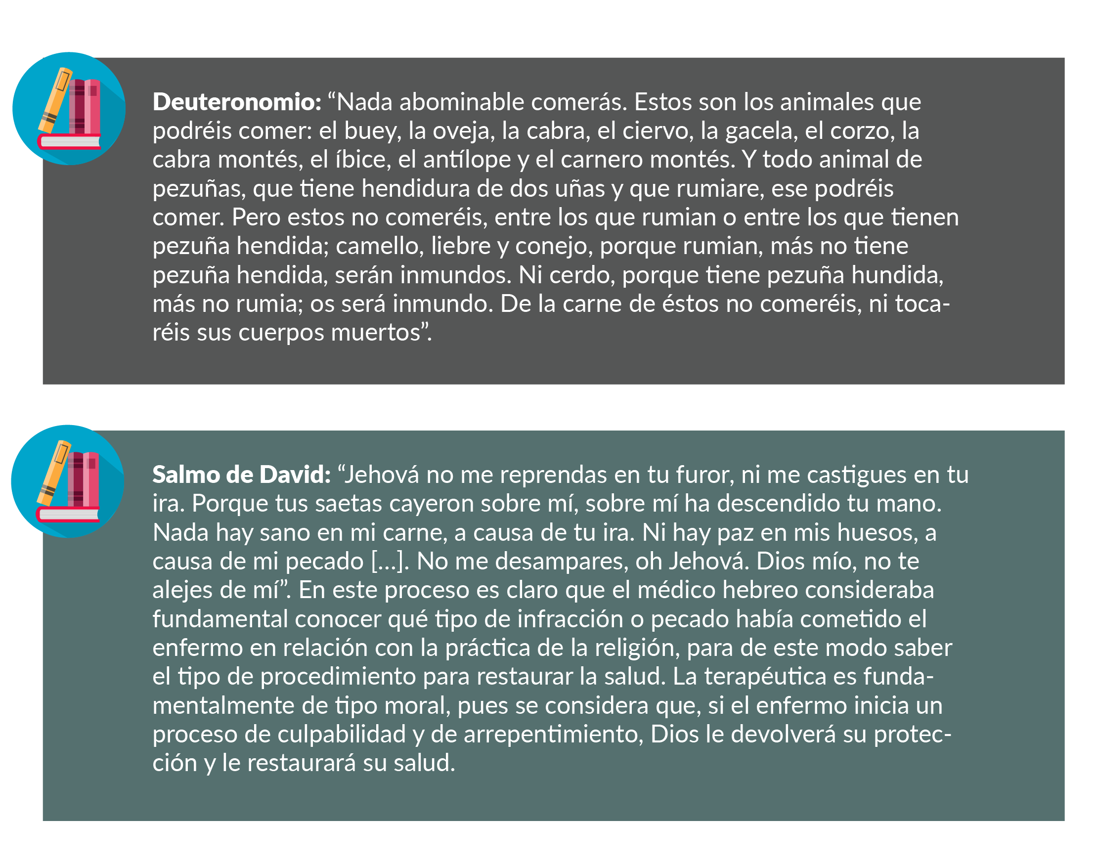 El pueblo hebreo considera que la existencia del mundo es obra de Dios, y considera que Jehová está en todo y que todo viene y va hacia él, incluyendo al hombre que es obra de Dios. Para comprender la medicina hebrea se debe recurrir a las fuentes como lo enunciado en los libros del Pentateuco, que forma parte de la Torá, libros sagrados escritos durante un milenio, que se complementan con la tradición oral de la Mishná, y que luego fueron recogidos en el Talmud. Los cinco libros de Moisés o Pentateuco recomendaban el aislamiento de los enfermos contagiosos, la desinfección de los objetos de casa por fuego, el cubrir de cal las casas en donde habitaban e incluso la demolición y arrasamiento de las moradas. El pueblo hebreo, y con él los sacerdotes y médicos, consideraban que la salud es un don divino, la enfermedad es un castigo de Dios por el pecado cometido y sólo se recupera la salud con la oración, los sacrificios y una conducta moral que es enseñada por los libros sagrados. Entre las prácticas relacionadas con la medicina, las ordenanzas militares sugieren que cada soldado debía llevar una pala en el cinto, a fin de que antes de la defecación cavara un hoyo en el suelo y posteriormente cubriera con tierra.