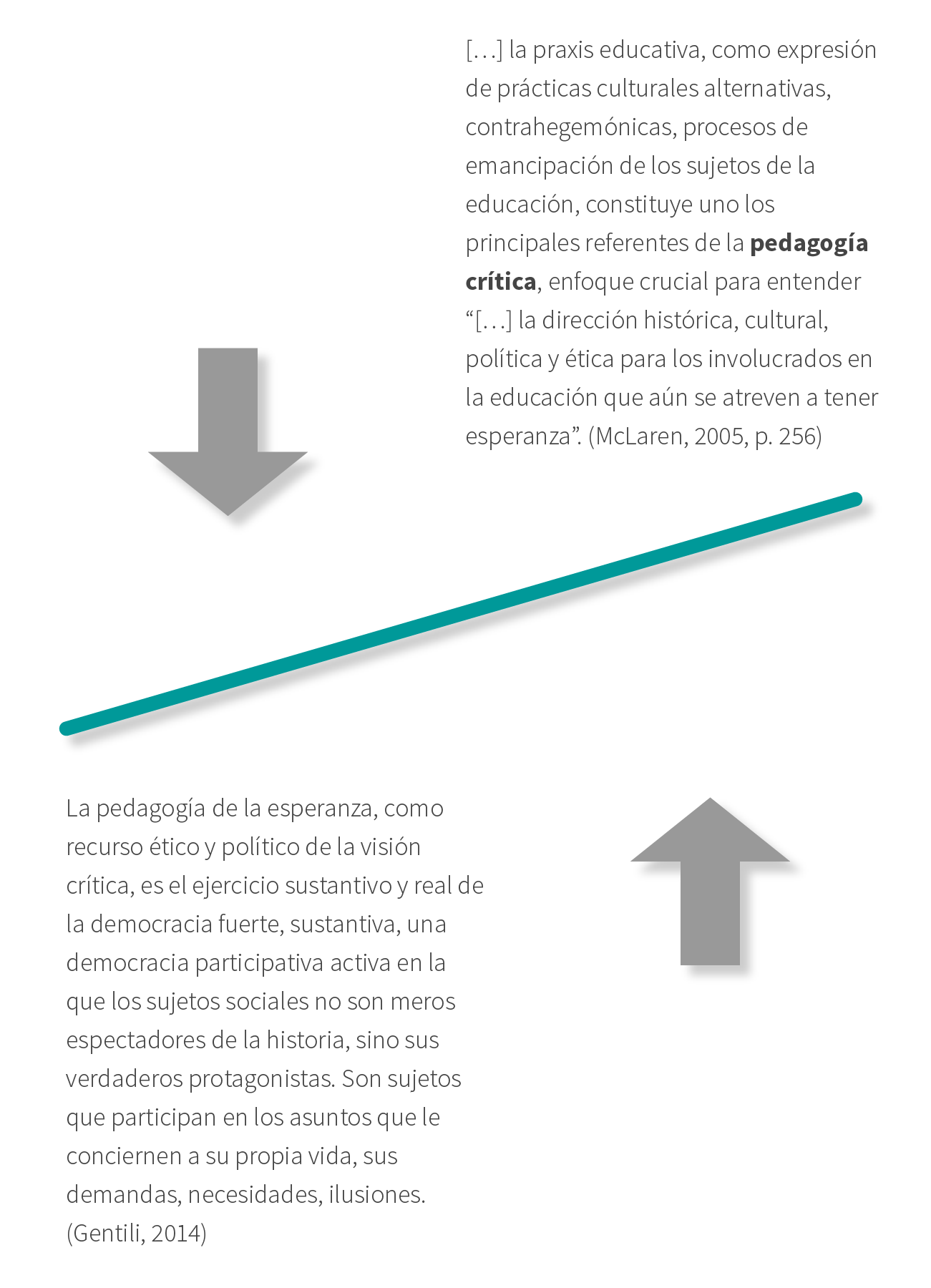 La praxis de una pedagogía crítica necesariamente se enlaza con los feminismos para cuestionar y desestabilizar todas las relaciones de poder asimétricas que se han naturalizado durante nuestra socialización y educación. Sentipensar la educación como una vía transformadora para crear un mundo basado en la igualdad de derechos, se cimienta en la esperanza, en la utopía como una guía con rutas bien definidas para accionar, resistir y liberarse de las cadenas opresoras provenientes de sistemas de dominación, como el patriarcado, clasismo, racismo, capitalismo, adultocentrismo, entre otras.