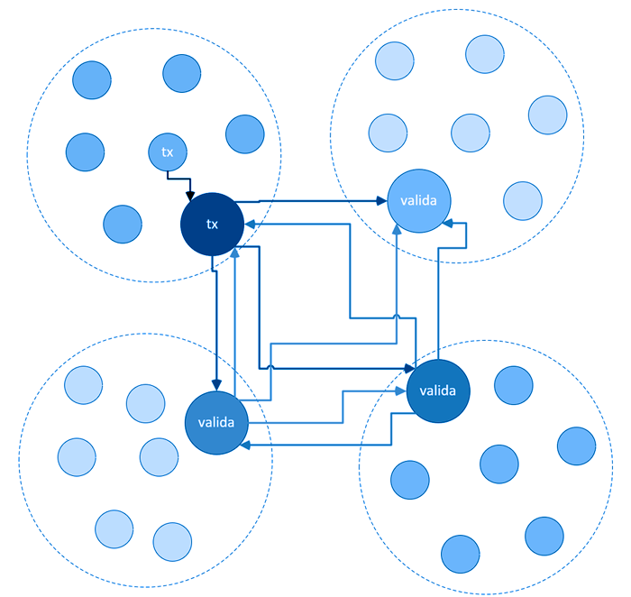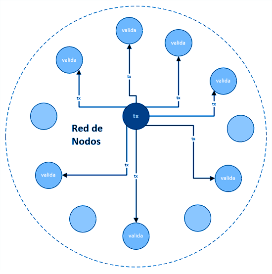 Cuando un nodo realiza una transición obtiene su hash y lo quiere agregar a la cadena. Debe comenzar un proceso de validación; para esto, les pide a otros nodos (51 %) que validen su transacción. Al terminar envían su respuesta al nodo que realizó la petición y si el resultado fue positivo, lo agrega a la cadena como un nuevo bloque. Este proceso se lleva a cabo en Bitcoin y es, por naturaleza, muy tardado.