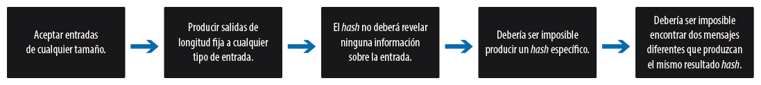 La función hash debe cumplir con ciertas propiedades para ser considerada una función hash criptográfica segura, las cuales son las siguientes: