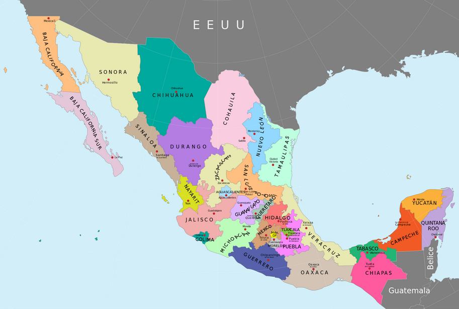 (s. a.) (s. f.). México [imagen]. Tomado de https://upload.wikimedia.org/wikipedia/commons/thumb/5/54/Mapa_pol%C3%ADtico_de_M%C3%A9xico_a_color_%28nombres_de_estados_y_capitales%29.svg/2000px-Mapa_pol%C3%ADtico_de_M%C3%A9xico_a_color_%28nombres_de_estados_y_capitales%29.svg.png
