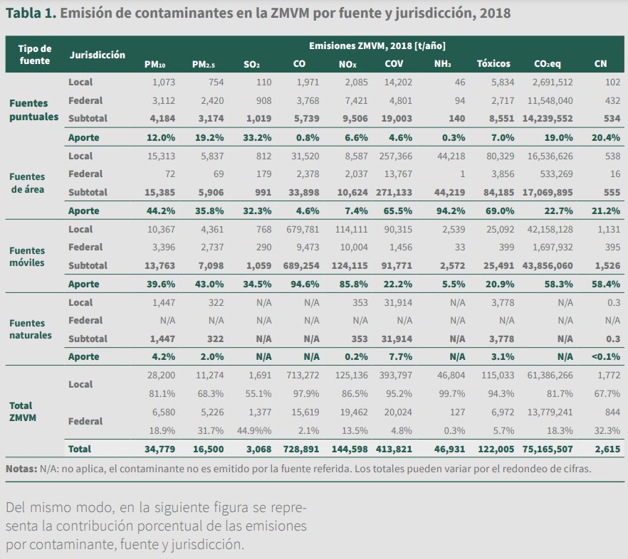 Tabla 1 del Inventario de emisiones de la CDMX para el 2018 (p. 21). http://www.aire.cdmx.gob.mx|x/descargas/publicaciones/flippingbook/inventario-emisiones-cdmx-2018/Inventario-de-emisiones-cdmx-2018.pdf