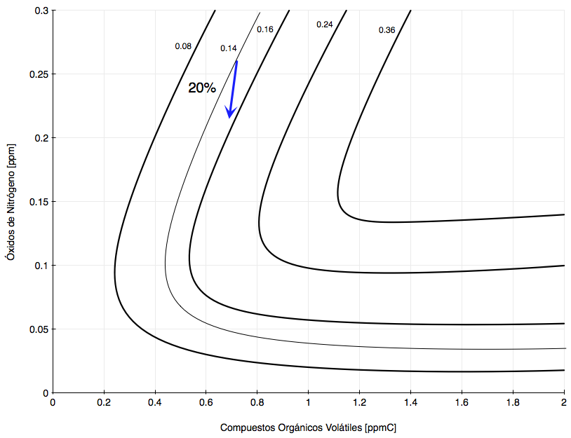 • En el caso de una atmósfera sensible a COV (en donde las reducciones de COV conllevan a la reducción de O3), al reducir NOx puede llegar a incrementar el O3 local, pero disminuir la concentración regional.