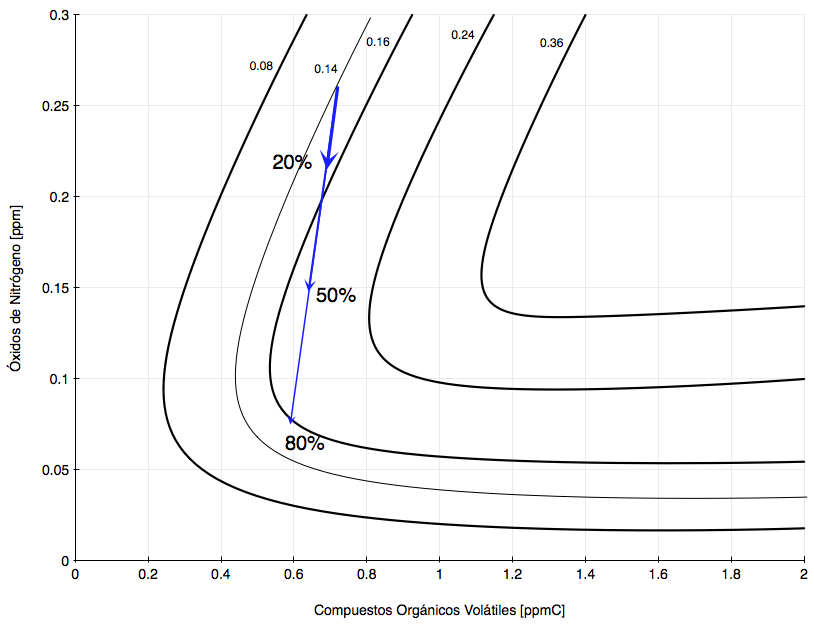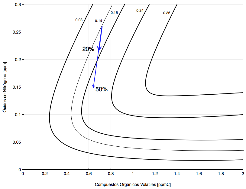 A partir de la sensibilidad al ozono y de disminuir el inventario de emisiones en la proporción de 20 %, 50 % y 83 % a las emisiones de NOx y COV de, exclusivamente, las fuentes móviles, se obtiene la nueva relación. Con la nueva relación, y en el diagrama de EKMA, identifica qué pasa con la concentración de ozono.