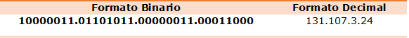 En el formato binario, se tienen dos valores: cero y uno; dependiendo de su posición dentro del octeto, cada número uno tiene un valor decimal; cuando se tiene cero, éste es nulo; por ejemplo, en el siguiente cuadro, el uno posee el valor más alto de 128; el más bajo, de uno. Para obtener el valor en notación decimal, se requiere sumar la cantidad de cada uno de ellos; es decir: 1 + 2 + 4 + 8 + 16 + 32 + 64 + 128= 255