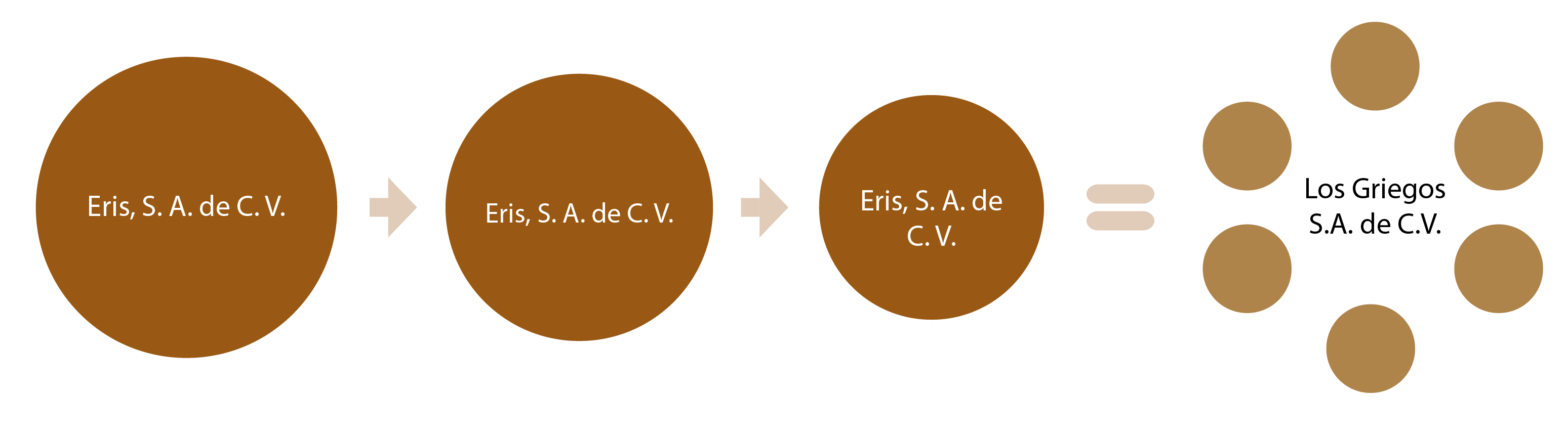 Ejemplo: La empresa Eris, S. A. de C. V. desaparecerá durante el proceso de escisión, para ceder la totalidad de sus activos, pasivos y capital a la entidad Los Griegos, S. A. de C. V.