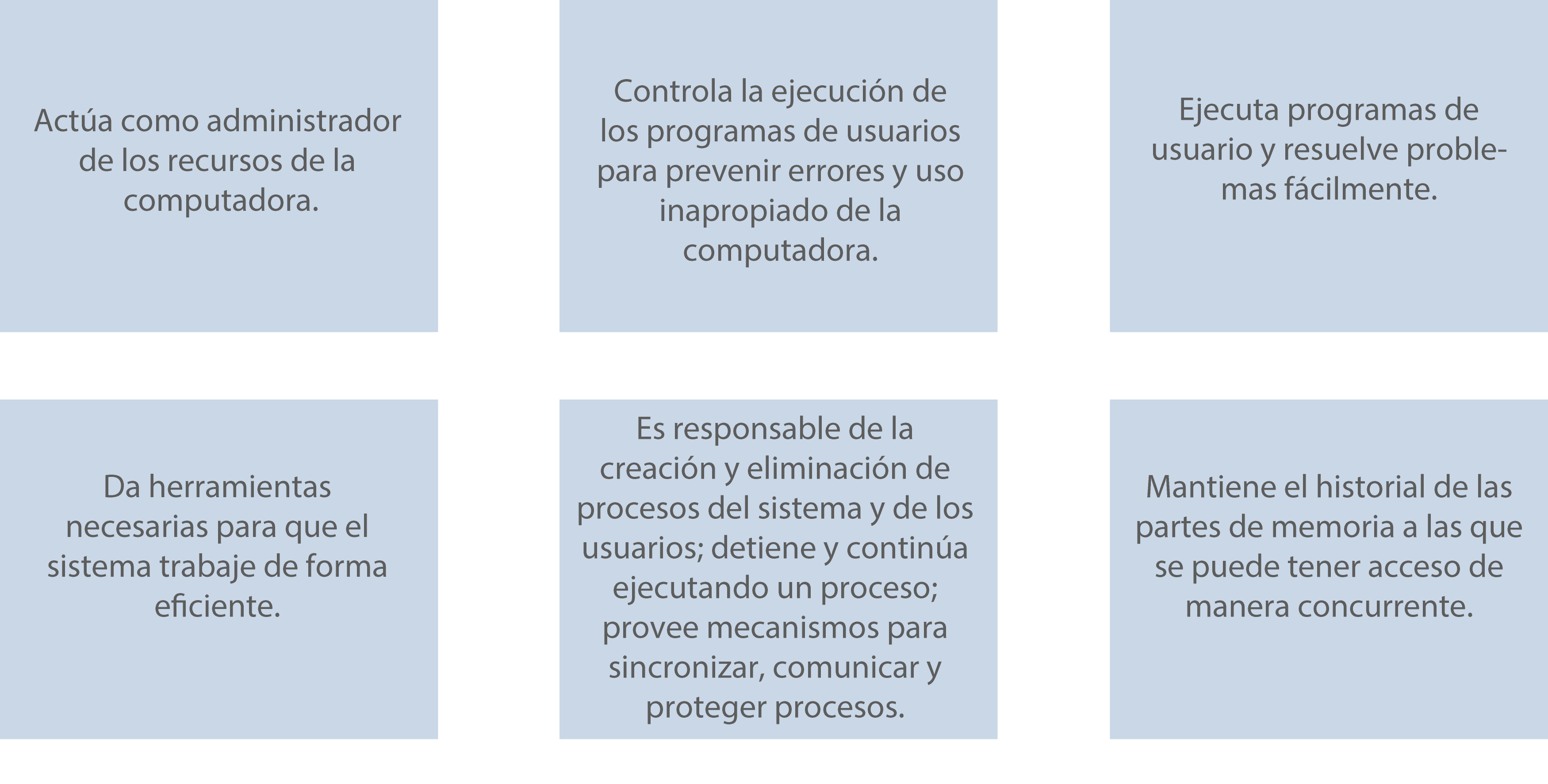 Como ya se mencionó, un SO actúa como interfaz entre la máquina y los programas de aplicaciones o el propio usuario. También se encarga de gestionar los recursos del sistema informático para obtener un uso óptimo de ellos. A continuación se tratarán las funciones del SO desde ambos puntos de vista, así como las características que debe presentar para mantener una capacidad de evolución adecuada.