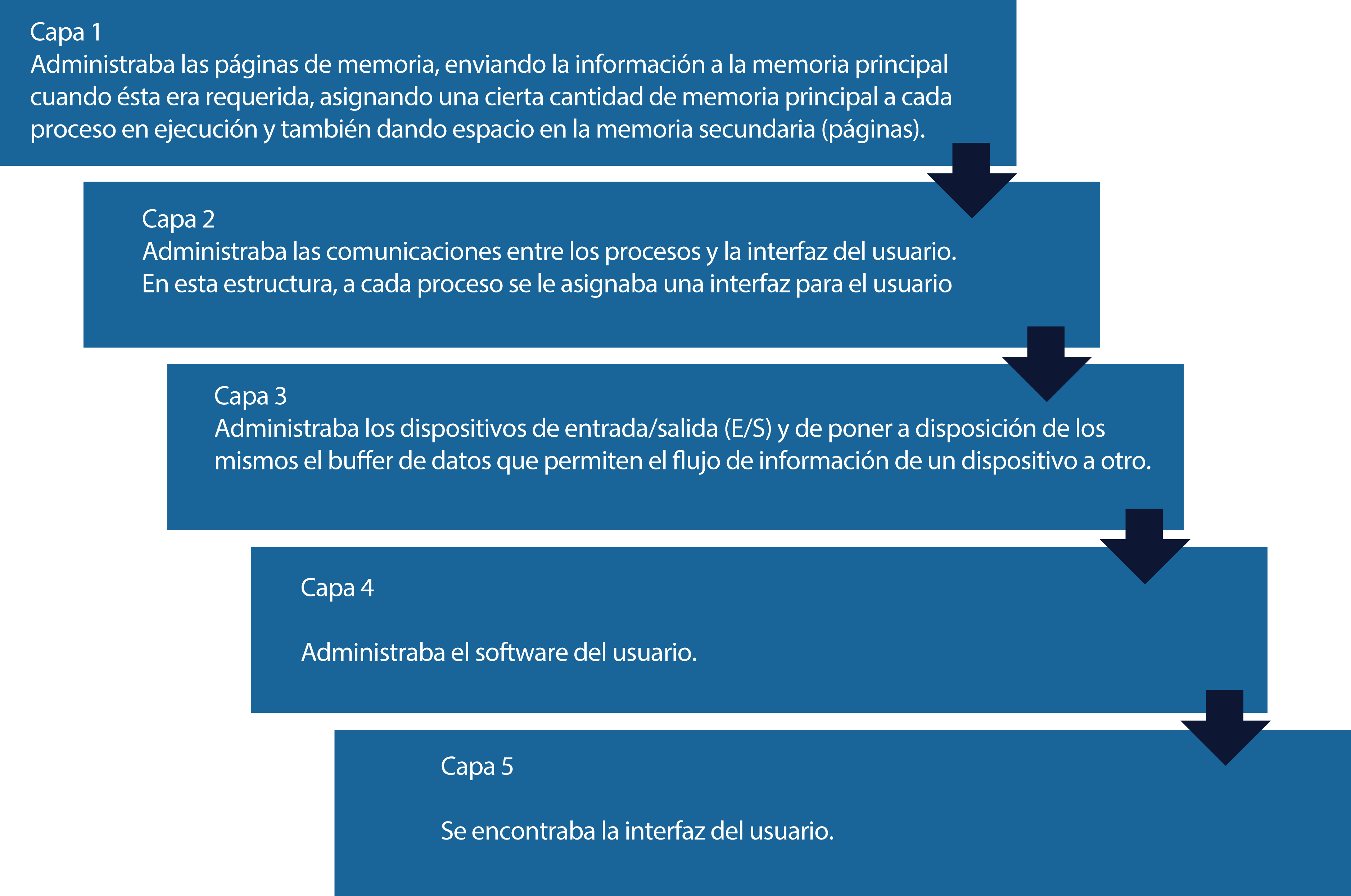 Como su nombre lo indica, consiste en la organización de las diversas funciones del sistema en una estructura jerárquica de capas, construidas a partir de una capa base encargada de la administración del procesador. El primer sistema operativo (SO) conocido con esta estructura fue construido por E. W. Dijkstra y sus estudiantes, en 1968, el THE (Technische Hogescholl Eindhoven), en los Países Bajos.