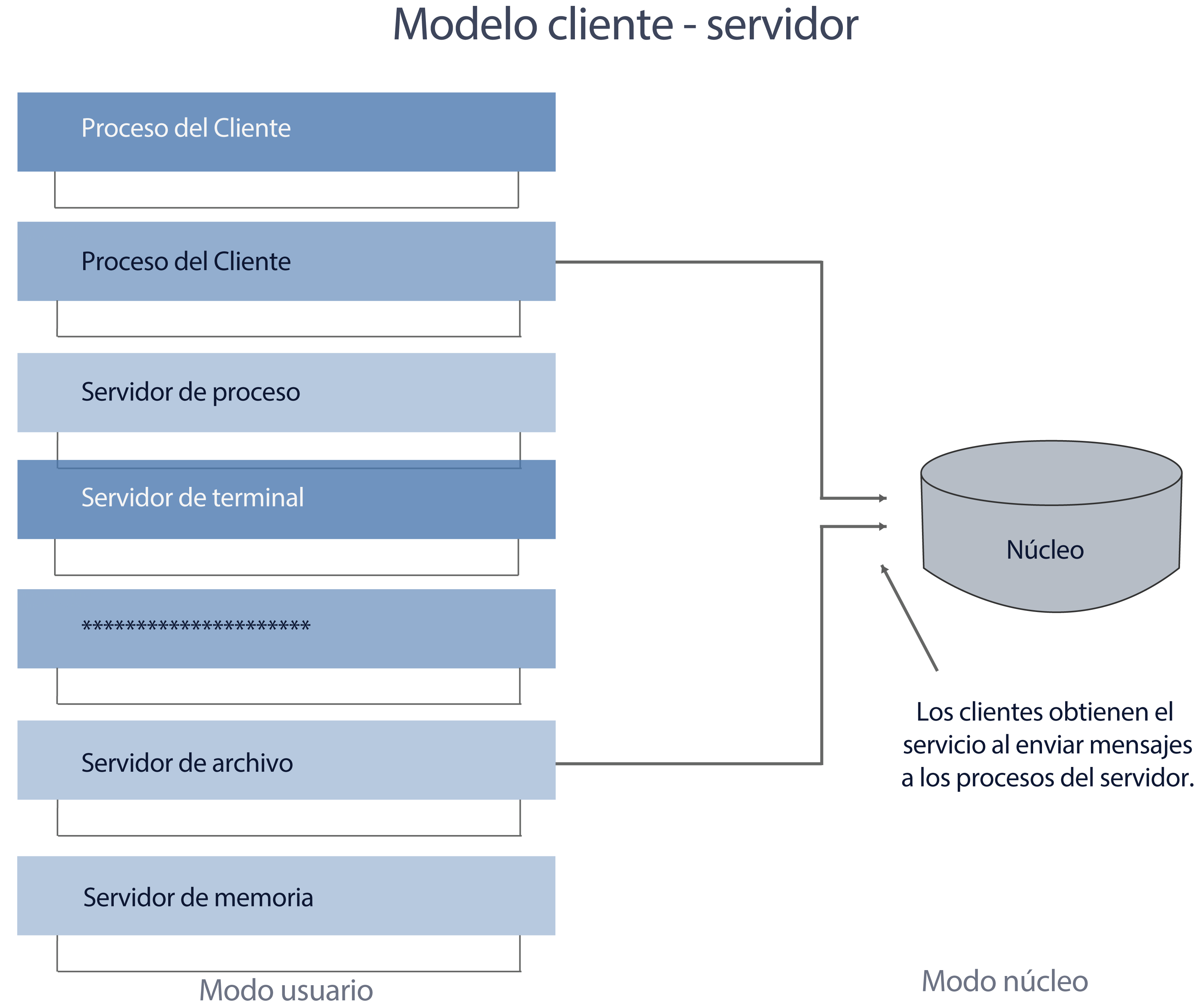 En el esquema cliente-servidor, los procesos de usuario (denominados procesos de cliente en este esquema) envían una solicitud a un proceso servidor, que al recibirla ejecuta las tareas solicitadas, regresando el resultado al proceso cliente.