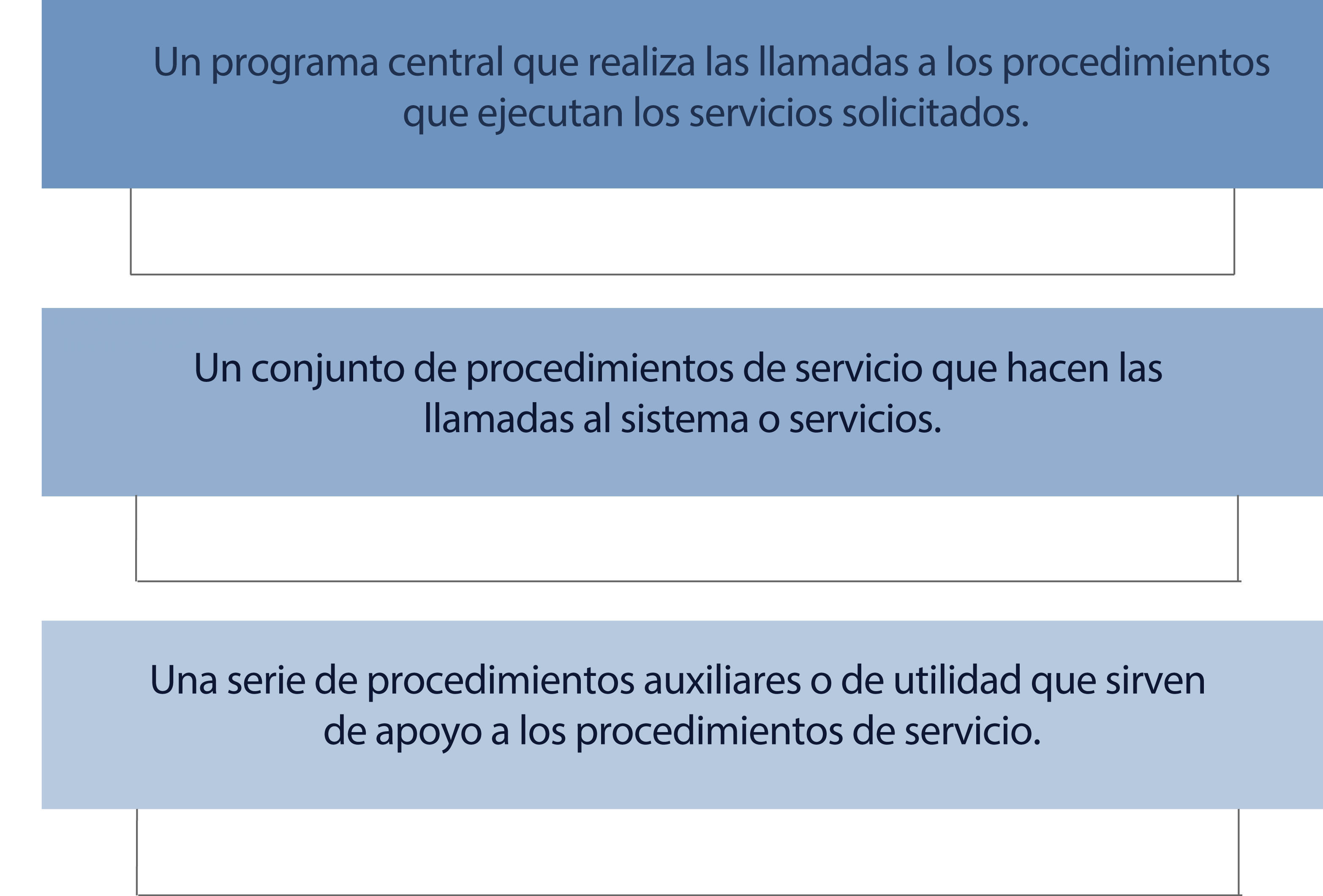 Por cada llamada realizada al sistema, en el modelo monolítico debe existir un procedimiento de servicio encargado de atenderla. Los procedimientos auxiliares o de utilidad reúnen la información necesaria para la correcta ejecución del procedimiento de servicio; por ejemplo, obtener datos de los programas ejecutados por el usuario.
