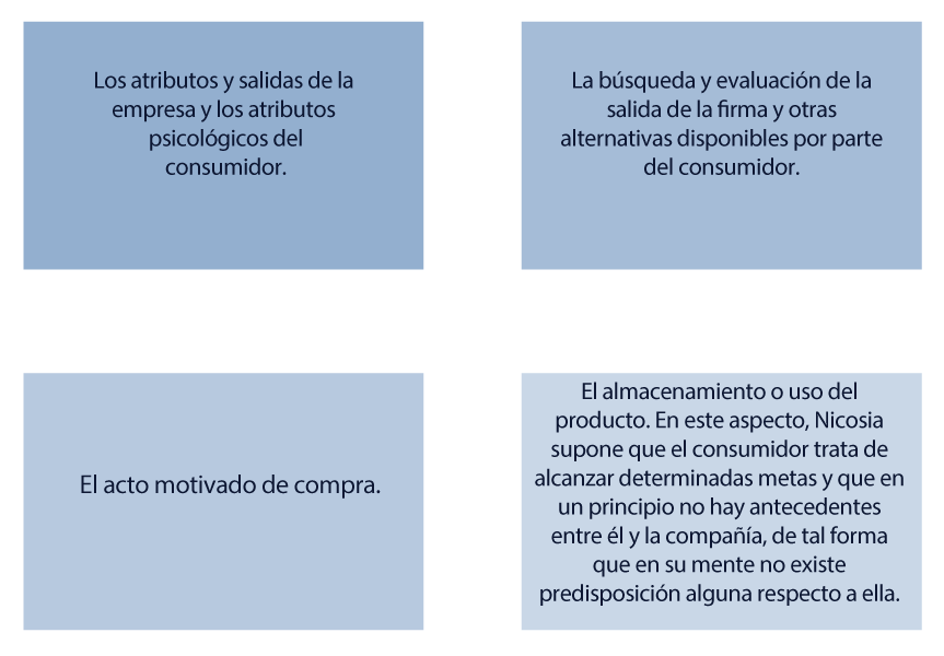 Francesco Nicosia (¿? -1997). Él presentó su modelo por medio de un diagrama de flujo, semejante a los pasos de un programa de computadora; consideraba que todas las variables interactúan sin que ninguna sea dependiente o independiente. El modelo describe un flujo circular de influencias en el que cada componente da la entrada al siguiente.