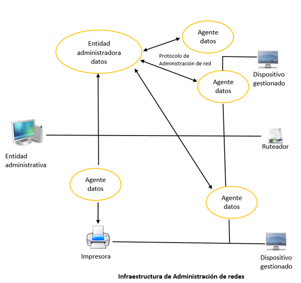 Red de seguridad (s. f.). Infraestructura de administración de redes [diagrama]. Tomada de http://redyseguridad.fip.unam.mx/pp/maru/labpracticas/Modelos_de_administracion_de_Red_2_1.pdf.